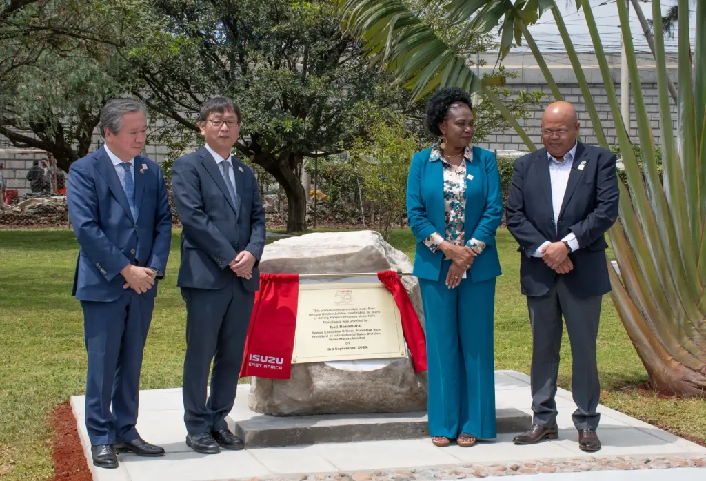 (L-R) Former Isuzu EA Chairman, Hiroshi Hisatomi, Senior Executive Officer, International Sales Division, Koji Nakamura, Isuzu EA Chair of the Board and Managing Director Rita Kavashe and Isuzu Motors South Africa President Tom Billy unveil the Isuzu EA 50th anniversary Plaque during 50th anniversary celebrations. The company’s journey into the next 50 years will be guided by the new global corporate philosophy introduced in 2023, ISUZU ID, which embodies the message “Moving the World, for You.”